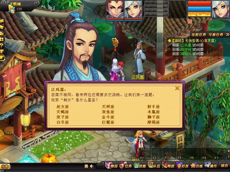 2.“心有灵犀”。根据任务提示寻找三名NPC,分别回答他们提出的问题,两名玩家选择相同答案才能通关。答题时可以与队友交流一下。这样可以促进男女玩家间的沟通哦。