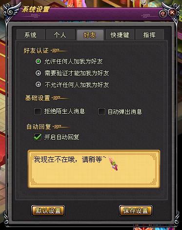 自动弹出消息:勾选后后收到玩家给你发的消息将自动弹出聊天窗口。